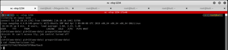 After filling in all of the requirements, browse to the product on the front page. Grab a PHP Reverse Shell, modify the parameters, rename the file to rev.phtml
